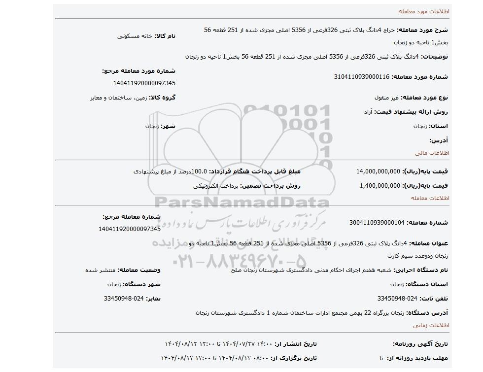 | عنوان معامله: 4دانگ پلاک ثبتی 326فرعی از 5356 اصلی مجزی شده از 251 قطعه 56 بخش1 ناحیه دو زنجان ودوعدد سیم کارت | ||