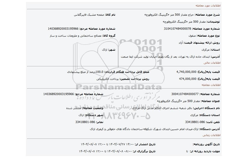 | عنوان معامله: مقدار 500 متر «گریتینگ الکتروفورج» | ||