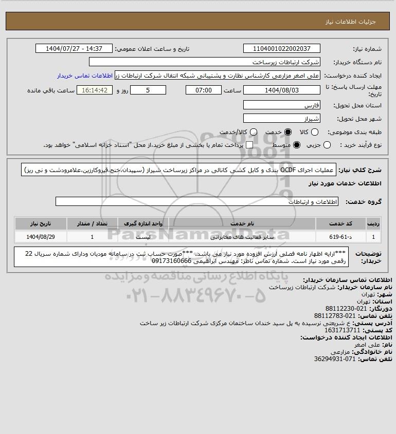 شرح کلی نیاز: عملیات اجرای OCDF بندی و کابل کشی کانالی در مراکز زیرساخت شیراز (سپیدان،خنج،قیروکارزین،علامرودشت و نی ریز)