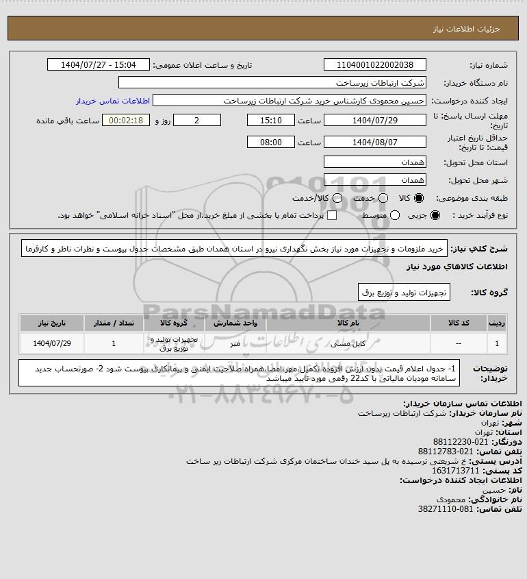 شرح کلی نیاز: خرید ملزومات و تجهیزات مورد نیاز بخش نگهداری نیرو در استان همدان طبق مشخصات جدول پیوست و نظرات ناظر و کارفرما