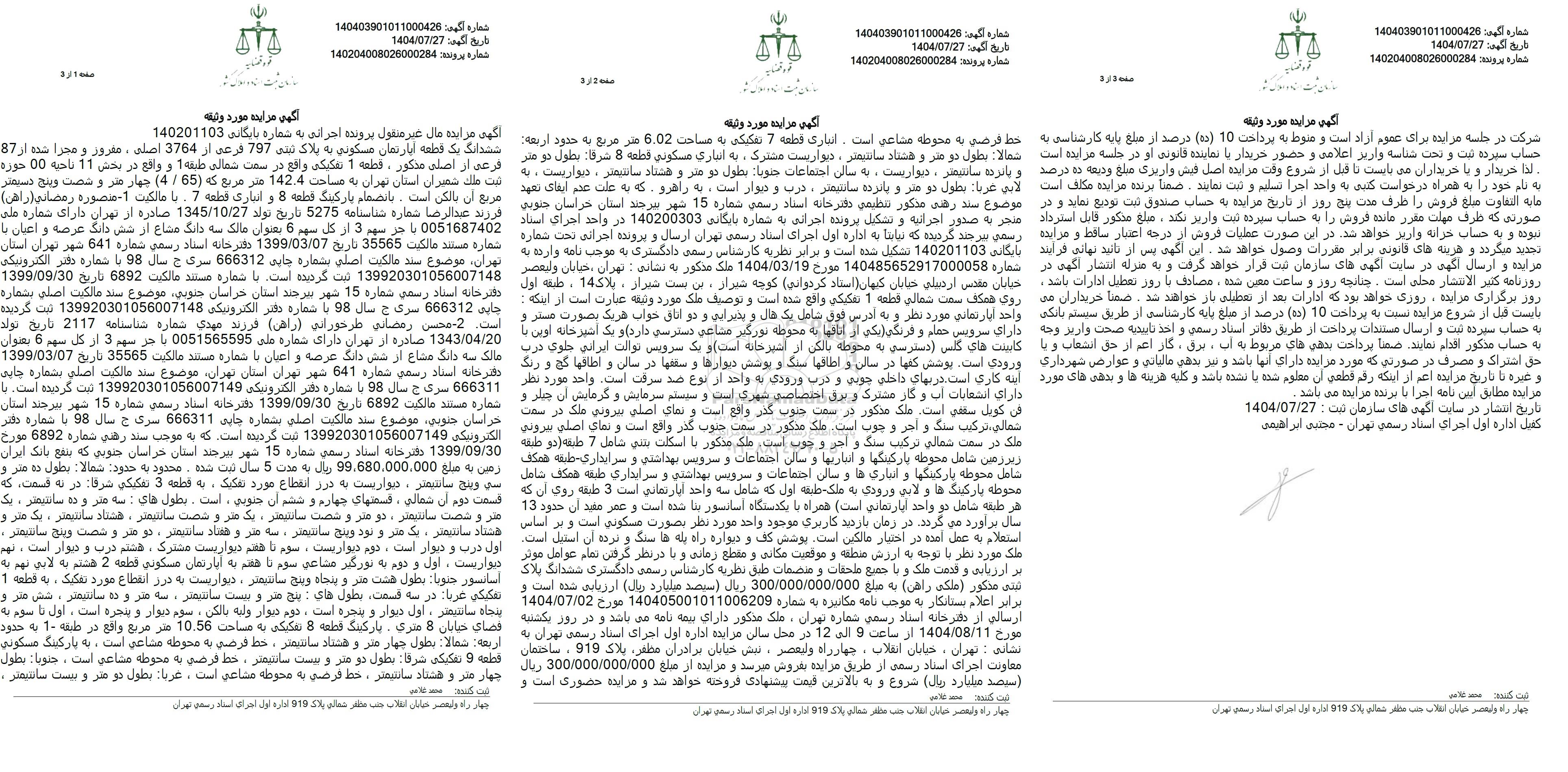 در روز یکشنبه مورخ 1404.08.11 از ساعت 9 الی 12 در محل سالن مزایده اداره اول اجرای اسناد رسمی تهران به : تهران ، خیابان انقلاب ، چهار راه ولیعصر ، پیش خیابان برادران مظفر پلاک 919، ساختمان معاونت اجرای اسناد رسمی