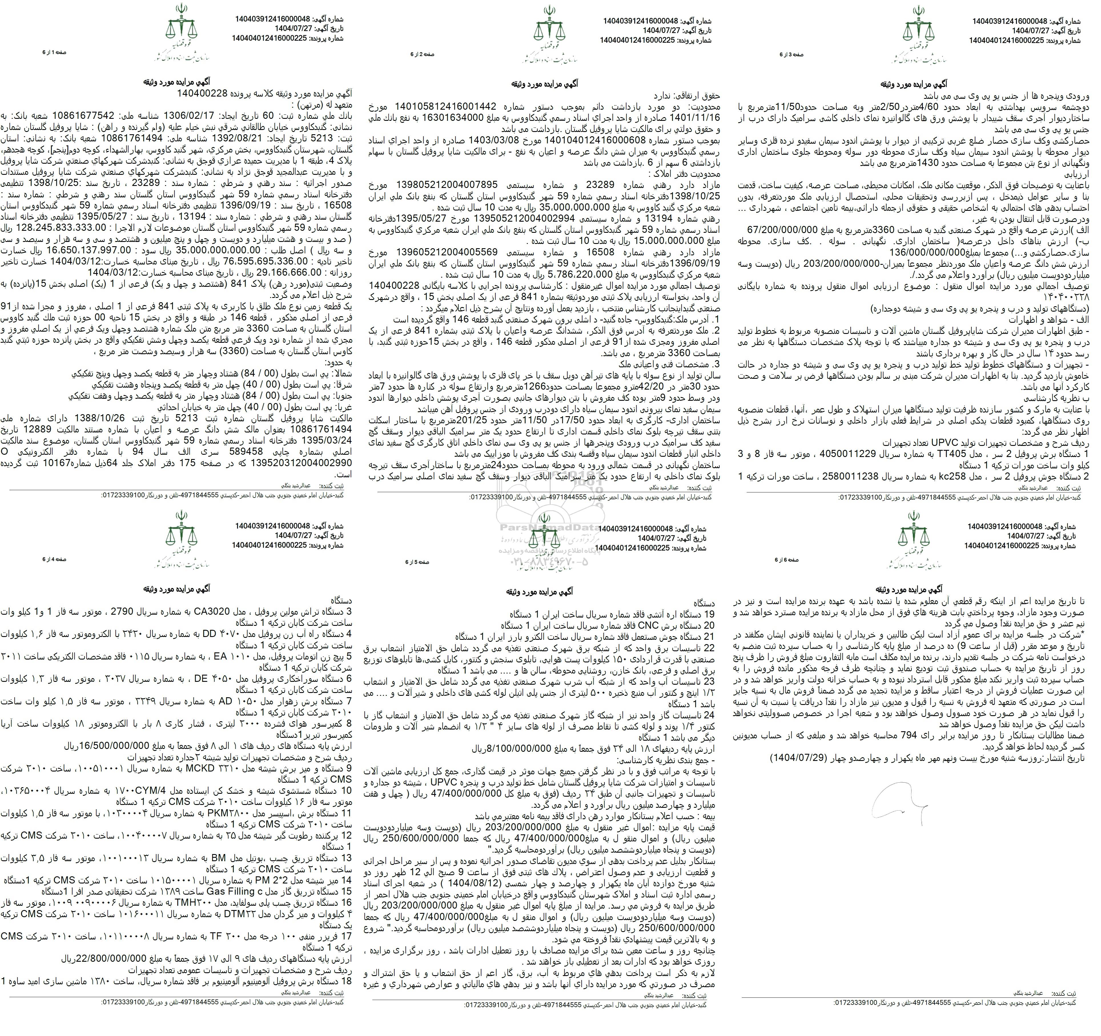 مزایده فروش: یک قطعه زمین نوع ملک طلق با کاربری به پلاک ثبتی 841 فرعی از 1 اصلی ، مفروز و مجزا شده از 91 فرعی از اصلی مذکور، قطعه 146 در طبقه و واقع در بخش 15 ناحيه 00 حوزه ثبت ملک گنبد کاووس استان گلستان به مساحت 3360 متر مربع متن ملک شماره هشتصد و چهل و یک فرعی از یک اصلی مفروز و مجزي شده از شماره نود و یک فرعي قطعه یکصد و چهل و شش تفکيکي واقع در بخش پانزده حوزه ثبتی گنبد کاوس استان گلستان به مساحت (3360) سه هزار و سیصد و شصت متر مربع