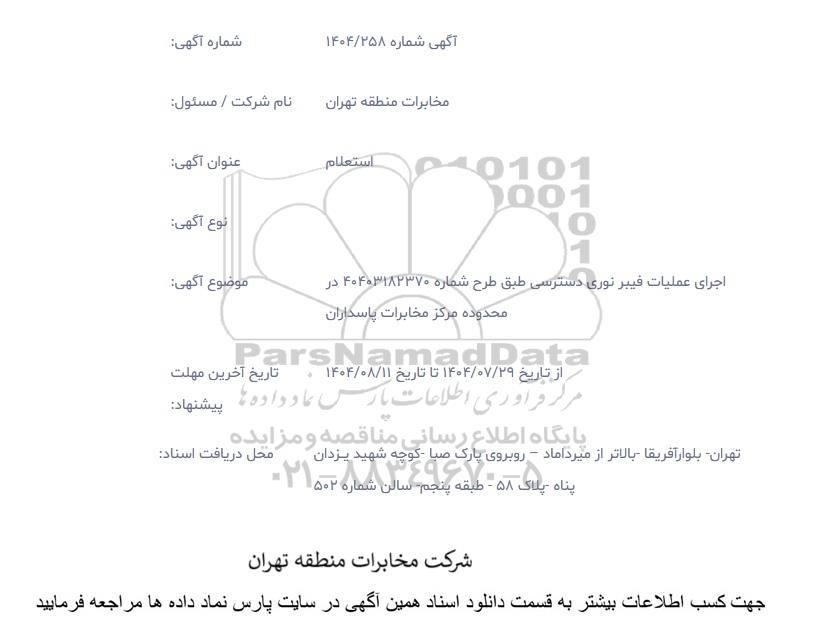 موضوع آگهی: اجرای عملیات فیبر نوری دسترسی طبق طرح شماره 40403182370 در محدوده مرکز مخابرات پاسداران