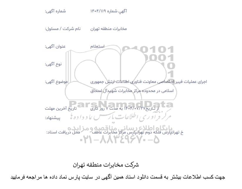 موضوع آگهی: اجرای عملیات فیبر اختصاصی معاونت فناوری اطلاعات ارتش جمهوری اسلامی در محدوده مرکز مخابرات شهید آل اسحاق