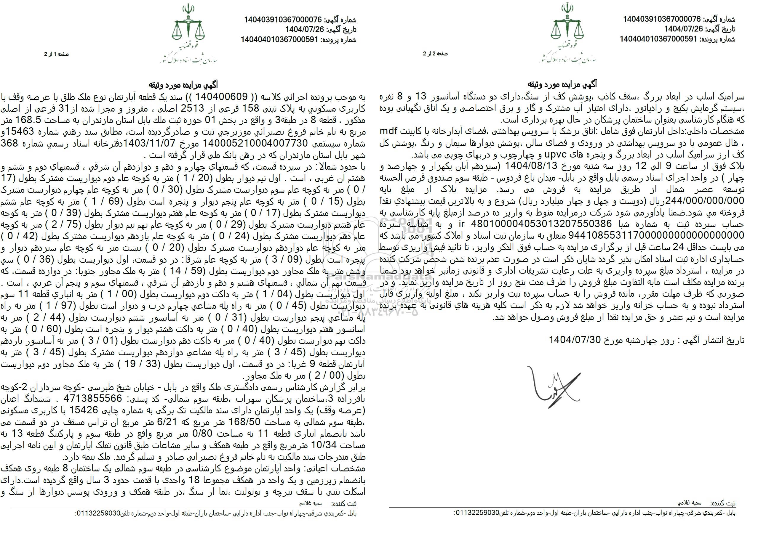 به موجب پرونده اجرائی کلاسه (( 140400609 )) سند یک قطعه آپارتمان نوع ملک طلق با عرصه وقف با کاربری مسکونی به پلاک ثبتی 158 فرعی از 2513 اصلی ، مفروز و مجزا شده از 31 فرعی از اصلی مذکور ، قطعه 8 در طبقه 3 و واقع در بخش 01 حوزه ثبت ملک بابل استان مازندران به مساحت 168.5 متر مربع به نام خانم فروغ نصیرائی موزیرجی ثبت و صادر گردیده است مطابق سند رهنی شماره 15463 و شماره سیستمی 140005210004007730 مورخ 1403.11.07 دفترخانه اسناد رسمی شماره 368 شهر بابل استان مازندران که در رهن بانک ملی قرار گرفته است.