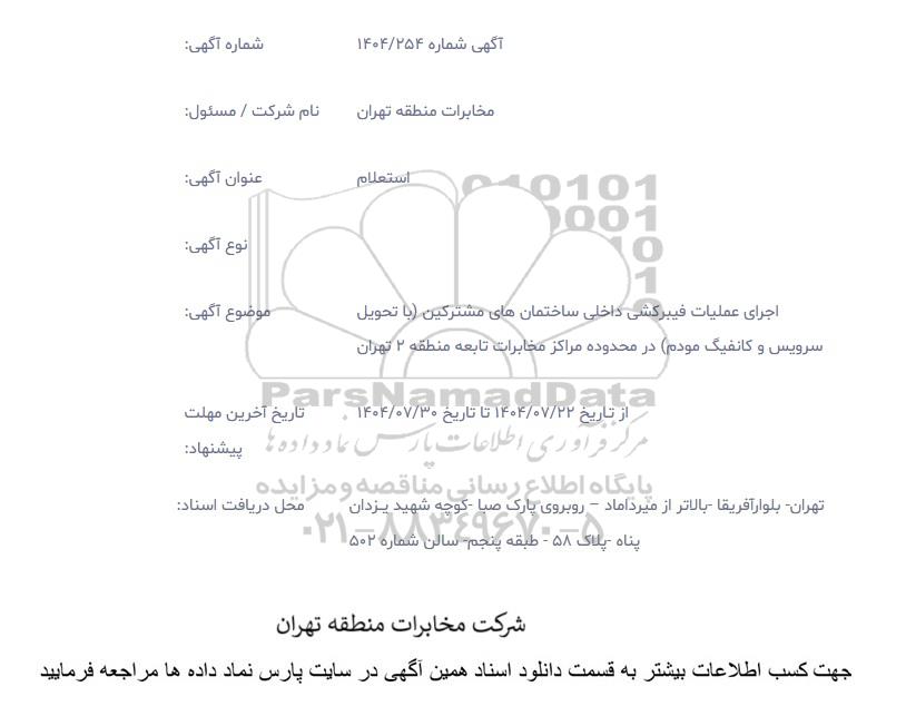 موضوع آگهی: اجرای عملیات فیبرکشی داخلی ساختمان های مشترکین با تحویل سرویس و کانفیگ مودم در محدوده مرکز مخابرات تابعه منطقه دو تهران