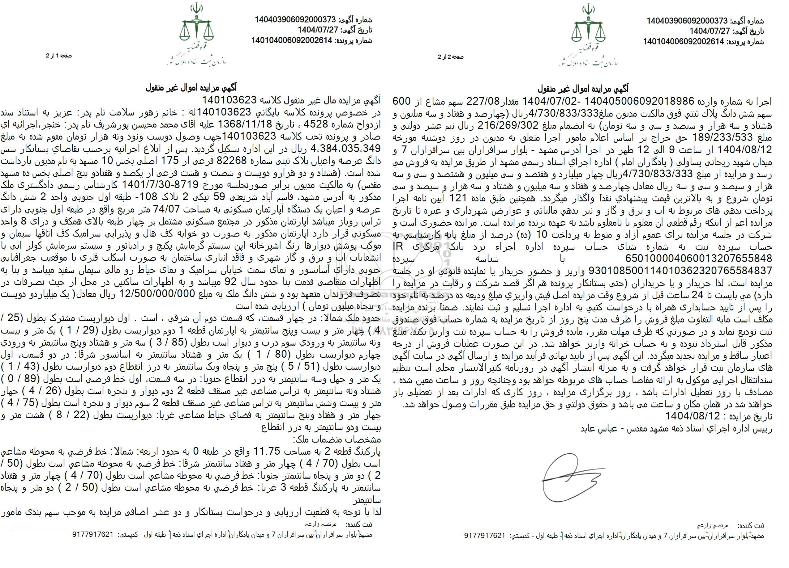 اجرا به شماره وارده 140405006092018986-1404.07.02 مقدار 227/08 سهم مشاع از 600 سهم شش دانگ بلاك ثبتي فوق مالكيت مديون مبلغ 4.730.833.333 ریال چهارصد و هفتاد و سه میلیون و هشتاد و سه هزار و سیصد و سی و سه تومان به انضمام مبلغ 216.269.302 ریال نیم عشر دولتی و مبلغ 189.233.533 حق حراج بر اساس اعلام مامور اجرا متعلق به مدیون در روز دوشنبه مورخه 1404.08.12 از ساعت 9 الی 12 ظهر در اجرا آدرس مشهد - بلوار سرافرازان بین سرافرازان 7 و میدان شهید ریحاني يساولی ) یادگاران امام ( اداره اجرای اسناد رسمی مشهد از طریق مزایده به فروش می رسد و مزایده از مبلغ 4.730.833.333 ریال چهار میلیارد و هفتصد و سی میلیون و هشتصد و سی و سه هزار و سیصد و سی و سه ریال معادل چهار صد و هفتاد و سه میلیون و هشتاد و سه هزار و سیصد و سی تومان شروع و به بالاترین قیمت پیشنهادی نقدا واگذار میگردد. همچنین طبق ماده 121 آیین نامه اجرا پرداخت بدهی های مربوط به آب و برق و گاز و نیز بدهی مالیاتی و عوارض شهرداری و غیره تا تاریخ مزایده اعم از اینکه رقم قطعی آن معلوم یا نا معلوم باشد به عهده برنده مزایده است. مزایده حضوری است و شرکت در جلسه مزایده برای عموم آزاد و منوط به پرداخت 10 (ده) درصد از مبلغ پایه کارشناسی به حساب سپرده ثبت به شماره شبای حساب سپرده اداره اجراء نزد بانک مرکزی IR650100004060013207655848 شناسه 930108500114010362320765584837 واریز و حضور خریدار یا نماینده قانونی او در جلسه مزایده است لذا خریدار و یا خریداران حتی بستانکار پرونده هم اگر قصد شرکت و رقابت در مزایده را دارد می بایست تا 24 ساعت قبل از شروع وقت مزایده اصل فیش واریزی مبلغ ودیعه ده درصد به نام خود را پس از تایید حسابداری همراه با درخواست کتبی به اداره اجرا تسلیم و ثبت نمایند. ضمنا برنده مزایده مكلف است ما به التفاوت مبلغ فروش را ظرف مدت پنج روز از تاریخ مزایده به شماره حساب فوق صندوق ثبت تودیع نماید و در صورتی که ظرف مهلت مقرر مانده فروش را به حساب سپرده ثبت واریز نکند، مبلغ مذکور قابل استرداد نبوده و به حساب خزانه واریز خواهد شد. در این صورت عملیات فروش از درجه اعتبار ساقط و مزایده تحدید میگردد. این آگهی پس از تایید نهایی فرایند مزایده و ارسال آگهی در سایت آگهی های سازمان ثبت قرار خواهد گرفت و به منزله انتشار آگهی در روزنامه کثیر الانتشار محلی است تنظیم سند انتقال اجرایی موکول به ارائه مفاصا حسابهای مربوطه خواهد بود و چنانچه روز و ساعت معین شده . مصادف با روز تعطیل ادارات باشد، روز برگزاری مزایده، روز کاری که ادارات بعد از تعطیلی باز خواهند شد در همان مکان و ساعت میباشد و حقوق دولتی و حق مزایده طبق مقررات وصول خواهد شد. 1404/08/12 : تاریخ مزایده