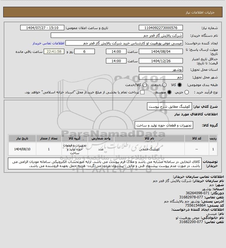 نام سازمان خریدار: شرکت پالایش گاز فجر جم