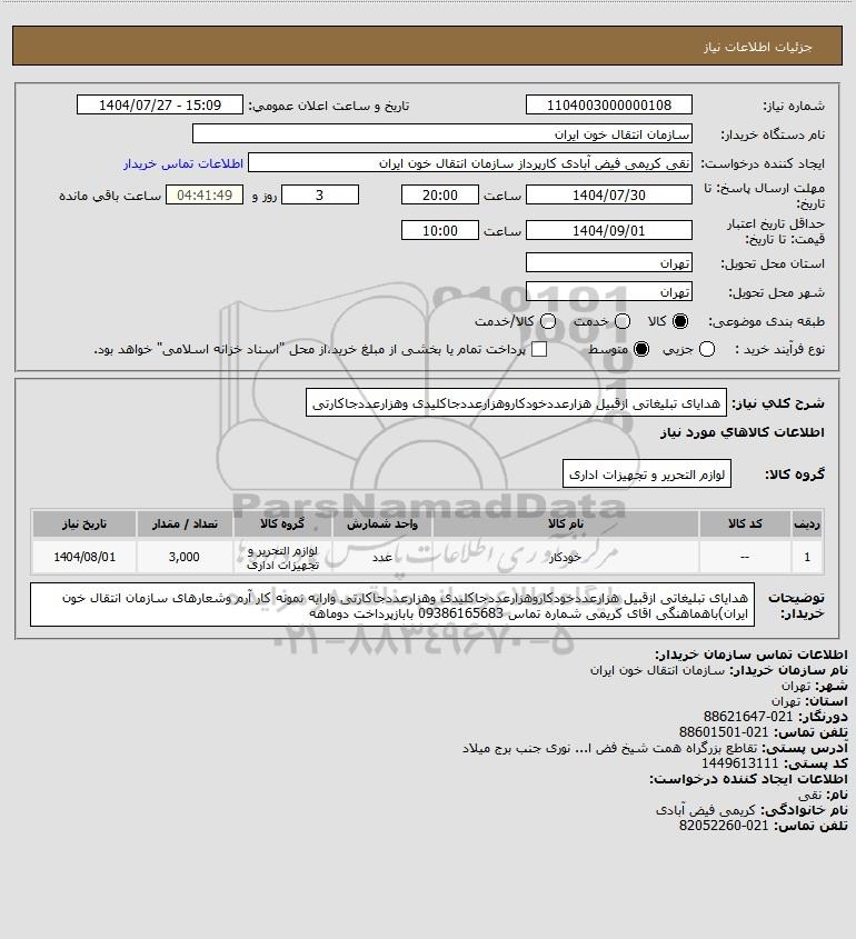 شرح کلی نیاز: هدایای تبلیغاتی ازقبیل هزارعددخودکاروهزارعددجاکلیدی وهزارعددجاکارتی