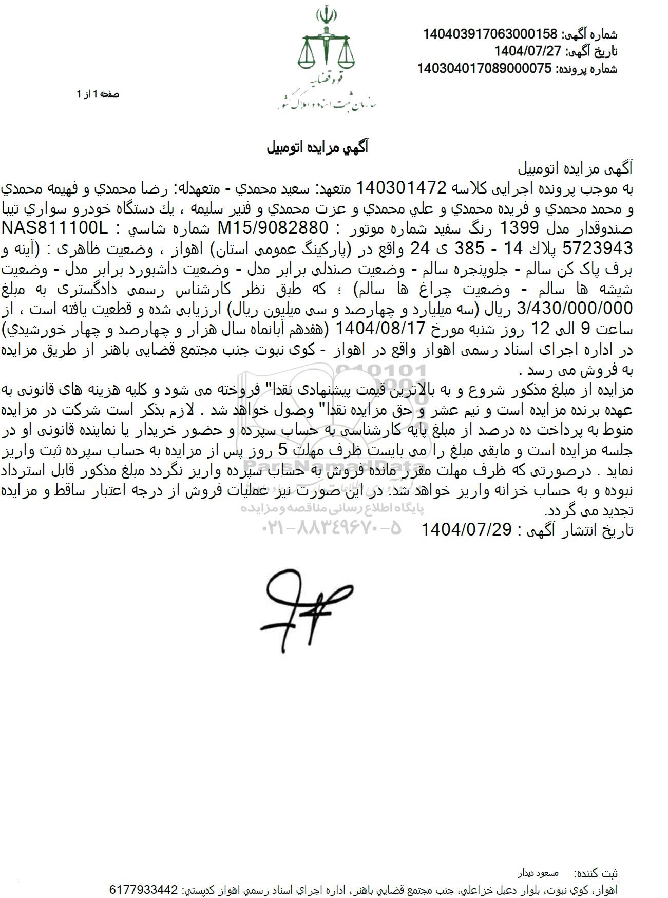 به موجب پرونده اجرایی کلاسه 140301472 متعهد: سعید محمدی - متعهدله: رضا محمدی و فهیمه محمدی و محمد محمدی و فریده محمدی و علی محمدی و عزت محمدی و فنیر سلیمه ، یک دستگاه خودرو سواری تیبا صندوقدار مدل 1399 رنگ سفید شماره موتور : M15.9082880 شماره شاسی : NAS811100L 5723943 پلاک 14 - 385 ی 24 واقع در (پارکینگ عمومی استان) اهواز ، وضعیت ظاهری : (آینه و برف پاک کن سالم - جلوپنجره سالم - وضعیت صندلی برابر مدل - وضعیت داشبورد برابر مدل - وضعیت شیشه ها سالم - وضعیت چراغ ها سالم) ؛ که طبق نظر کارشناس رسمی دادگستری به مبلغ 3.430.000.000 ریال (سه میلیارد و چهارصد و سی میلیون ریال) ارزیابی شده و قطعیت یافته است ، از ساعت 9 الی 12 روز شنبه مورخ 1404.08.17 (هفدهم آبانماه سال هزار و چهارصد و چهار خورشیدی) در اداره اجرای اسناد رسمی اهواز واقع در اهواز - کوی نبوت جنب مجتمع قضایی باهنر از طریق مزایده به فروش می رسد .