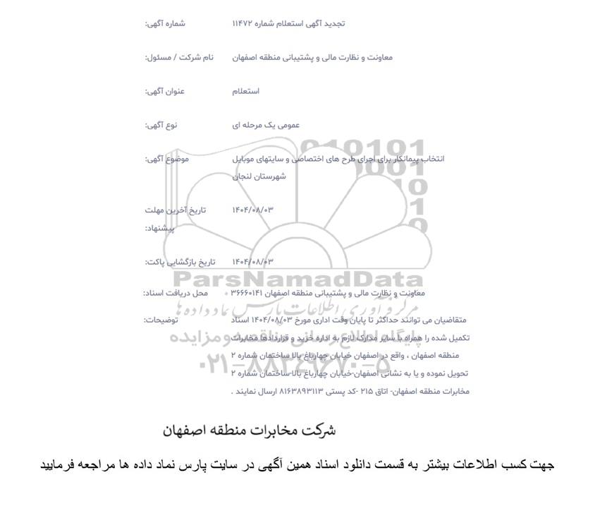 موضوع اگهی: انتخاب پیمانکار برای اجرای طرح های اختصاصی و سایتهای موبایل شهرستان لنجان