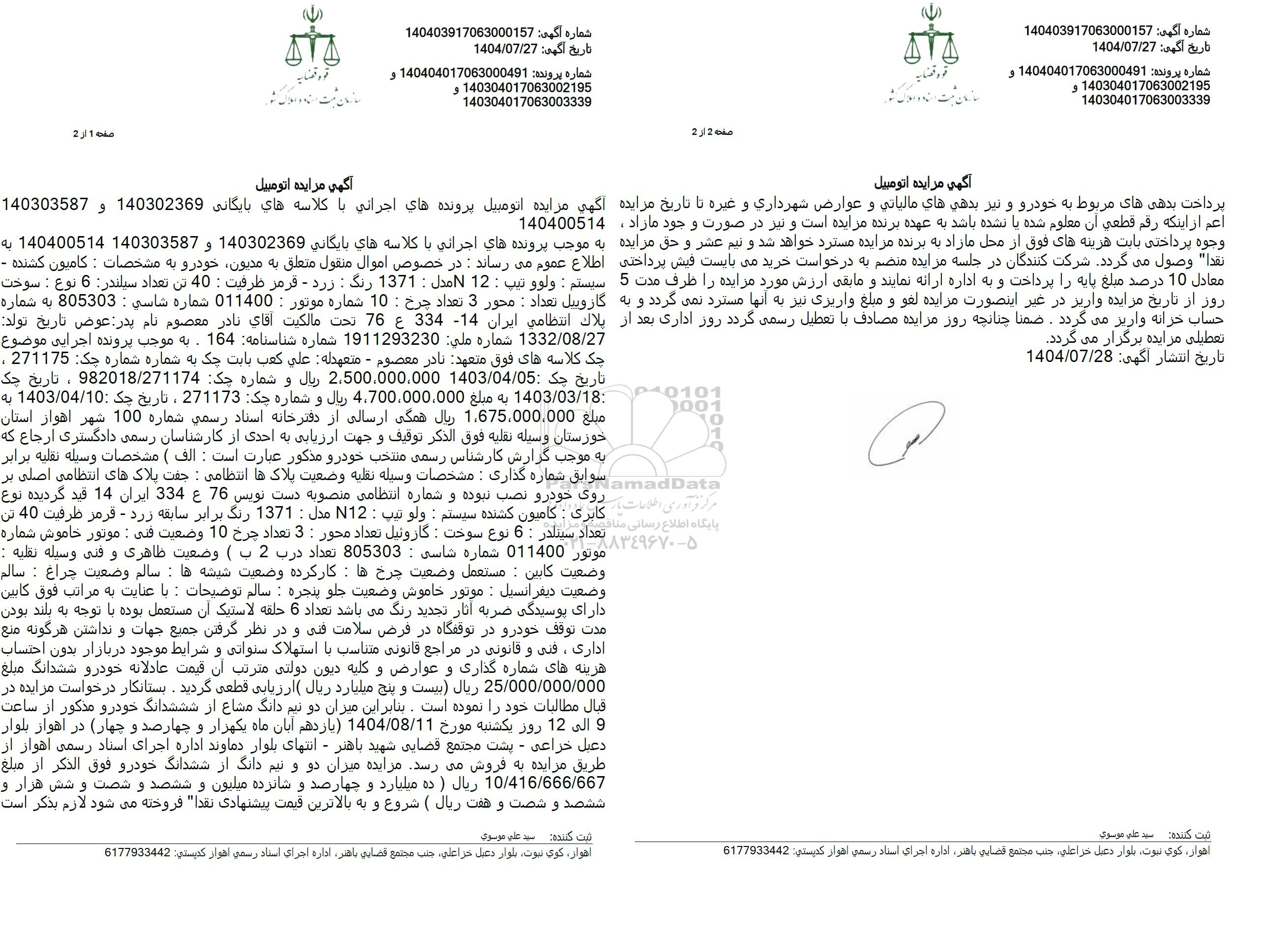 آگهی مزایده اتومبیل پرونده هاي اجرایی با کلاسه های بایگانی 140302369 و 140303587