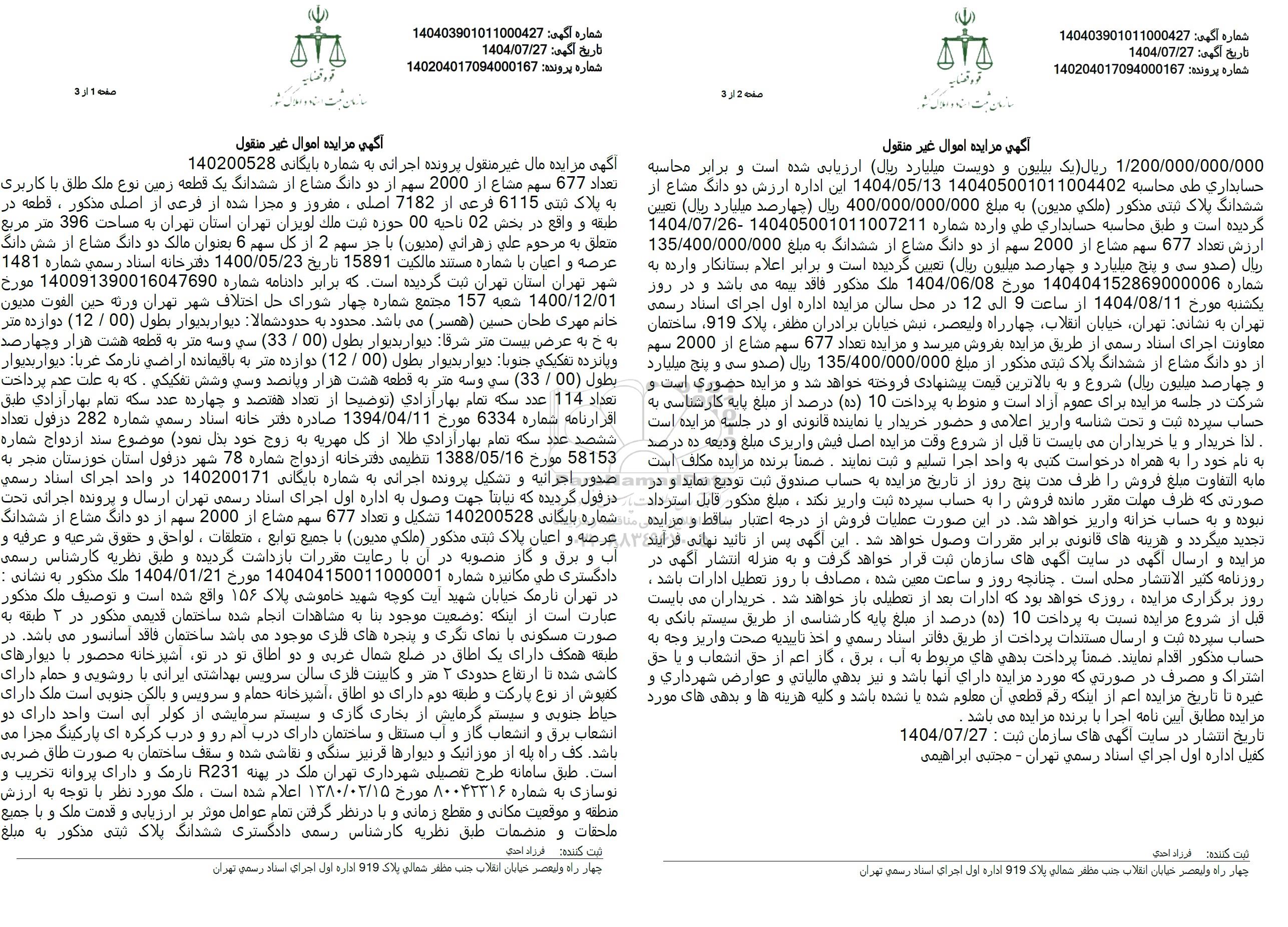 1.200.000.000.000 ریال یک بیلیون و دویست میلیارد ریال ارزیابی شده است و برابر محاسبه حسابداری طی محاسبه 140405001011004402 1404.05.13 این اداره ارزش دو دانگ مشاع از ششدانگ پلاک ثبتی مذکور ملكي مديون به مبلغ 400.000.000.000 ریال چهارصد میلیارد ریال تعیین گردیده است و طبق محاسبه حسابداري طي وارده شماره 140405001011007211 -1404/07/26 ارزش تعداد 677 سهم مشاع از 2000 سهم از دو دانگ مشاع از ششدانگ به مبلغ 135.400.000.000 ريال صدو) سی و پنج میلیارد و چهارصد میلیون ریال تعیین گردیده است و برابر اعلام بستانکار وارده به شماره 140404152869000006 مورخ 1404.06.08 ملک مذکور فاقد بیمه می باشد و در روز یکشنبه مورخ 1404.08.11 از ساعت 9 الی 12 در محل سالن مزایده اداره اول اجرای اسناد رسمی تهران به نشانی تهران خیابان انقلاب چهارراه ولیعصر نبش خیابان برادران مظفر پلاک 919 ساختمان معاونت اجرای اسناد رسمی از طریق مزایده بفروش میرسد و مزایده تعداد 677 سهم مشاع از 2000 سهم از دو دانگ مشاع از ششدانگ پلاک ثبتی مذکور از مبلغ 135.400.000.000 ریال صدو سی و پنج میلیارد و چهارصد میلیون ریال شروع و به بالاترین قیمت پیشنهادی فروخته خواهد شد و مزایده حضوری است و شرکت در جلسه مزایده برای عموم آزاد است و منوط به پرداخت 10 (ده) درصد از مبلغ پایه کارشناسی به حساب سپرده ثبت و تحت شناسه واریز اعلامی و حضور خریدار با نماینده قانونی او در جلسه مزایده است. لذا خریدار و با خریداران میبایست تا قبل از شروع وقت مزایده اصل فیش واریزی مبلغ ودیعه ده درصد به نام خود را به همراه درخواست کتبی به واحد اجرا تسلیم و ثبت نمایند . ضمنا برنده مزایده مکلف است. مابه التفاوت مبلغ فروش را ظرف مدت پنج روز از تاریخ مزایده به حساب صندوق ثبت تودیع نماید و در صورتی که ظرف مهلت مقرر مانده فروش را به حساب سپرده ثبت واریز نکند، مبلغ مذکور قابل استرداد نبوده و به حساب خزانه واریز خواهد شد. در این صورت عملیات فروش از درجه اعتبار ساقط و مزایده تجدید میگردد و هزینه های قانونی برابر مقررات وصول خواهد شد. این آگهی پس از تائید نهایی فرایند مزایده و ارسال آگهی در سایت آگهی های سازمان ثبت قرار خواهد گرفت و به منزله انتشار آگهی در روزنامه کثیر الانتشار محلی است. چنانچه روز و ساعت معین شده، مصادف با روز تعطیل ادارات باشد . روز برگزاری مزایده روزی خواهد بود که ادارات بعد از تعطیلی باز خواهند شد. خریداران می بایست قبل از شروع مزایده نسبت به پرداخت 10 (ده) درصد از مبلغ پایه کارشناسی از طریق سیستم بانکی به حساب سپرده ثبت و ارسال مستندات پرداخت از طریق دفاتر اسناد رسمي و اخذ تاييديه صحت واریز وجه به حساب مذکور اقدام نمایند. ضمنا پرداخت بدهی های مربوط به آب، برق، گار اعم از حق انشعاب و یا حق اشتراک و مصرف در صورتی که مورد مزایده دارای آنها باشد و نیز بدهی مالیاتی و عوارض شهرداری و غیره تا تاریخ مزایده اعم از اینکه رقم قطعی آن معلوم شده یا نشده باشد و کلیه هزینه ها و بدهی های مورد مزایده مطابق آیین نامه اجرا با برنده مزایده می باشد.