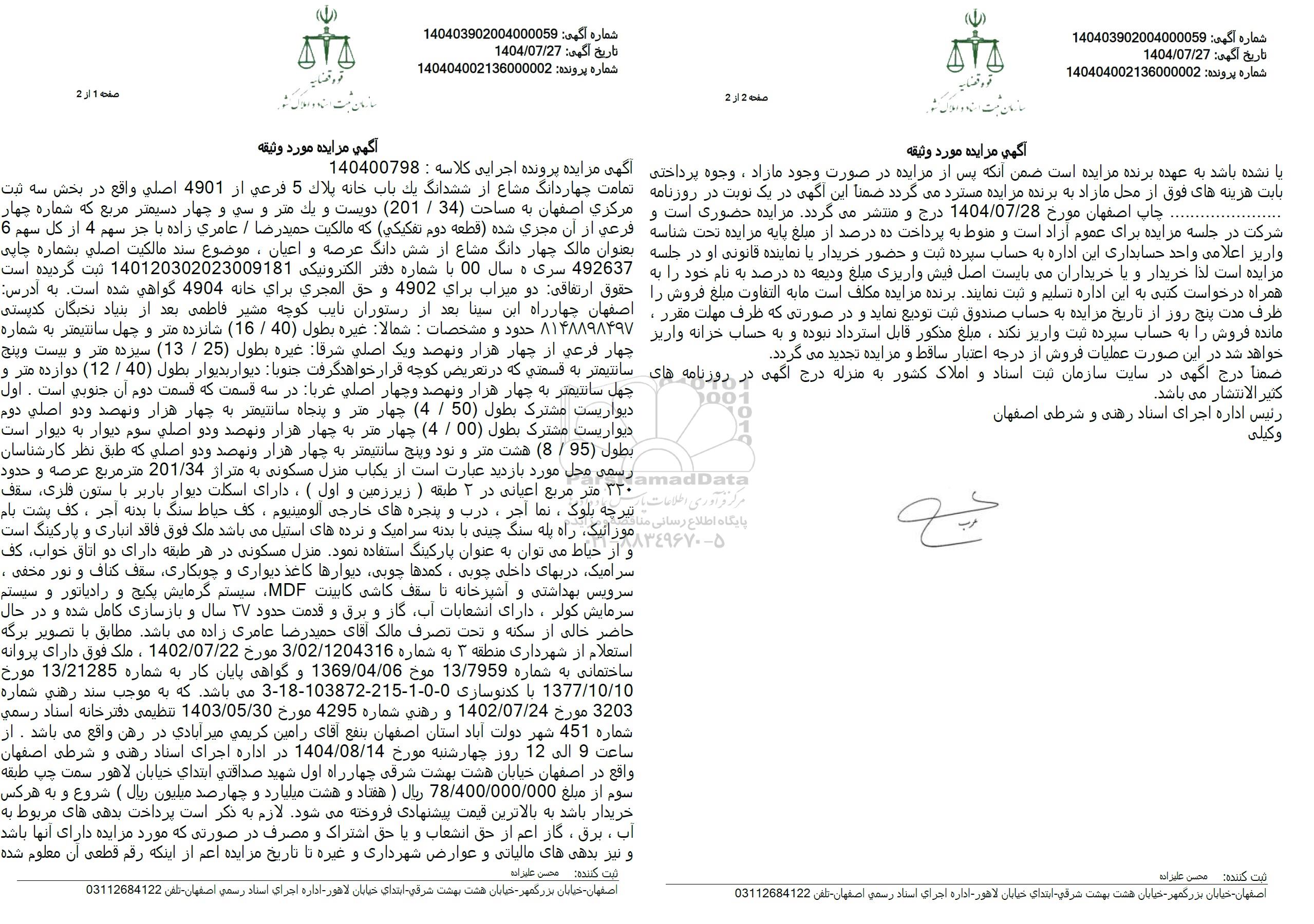 تمامت چهاردانگ مشاع از ششدانگ یک باب خانه پلاک 5 فرعی از 4901 اصلی واقع در بخش سه ثبت مرکزی اصفهان به مساحت (201.34) دویست و یک متر و سی و چهار دسیمتر مربع که شماره چهار فرعی از آن مجزی شده قطعه دوم تفکیکی که مالکیت حمیدرضا . عامری زاده با جز سهم 4 از کل سهم 6 بعنوان مالک چهار دانگ مشاع از شش دانگ عرصه و اعیان، موضوع سند مالکیت اصلی بشماره چاپی 492637 سری 5 سال 00 با شماره دفتر الکترونیکی 140120302023009181 ثبت گردیده است حقوق ارتفاقی دو میزاب برای 4902 و حق المجری برای خانه 4904 گواهی شده است. به آدرس: اصفهان چهارراه ابن سینا بعد از رستوران نایب کوچه مشیر فاطمی بعد از بنیاد نخبگان کدپستی 8148898497 حدود و مشخصات : شمالا غیره بطول (40) . (16) شانزده متر و چهل سانتیمتر به شماره چهار فرعی از چهار هزار و نهصد و یک اصلی شرقا غیره بطول (25) . (13) سیزده متر و بیست و پنج سانتیمتر به قسمتی که در تعریض کوچه قرار خواهد گرفت جنوبا دیوار بدیوار بطول (40) . (12) دوازده متر و چهل سانتیمتر به چهار هزار و نهصد و چهار اصلی غربا در سه قسمت که قسمت دوم آن جنوبی است . اول دیواریست مشترک بطول (50) . (4) چهار متر و پنجاه سانتیمتر به چهار هزار و نهصد ودو اصلی دوم دیواریست مشترک بطول 00 . (4) چهار متر به چهار هزار و نهصد و دو اصلی سوم دیوار به دیوار است بطول 95 . 8 هشت متر و نود و پنج سانتیمتر به چهار هزار و نهصد و دو اصلی که طبق نظر کارشناسان رسمی محل مورد بازدید عبارت است از یکباب منزل مسکونی به متراژ 201.34 متر مربع عرصه و حدود 320 متر مربع اعیانی در 2 طبقه ) زیر زمین و اول ) ، دارای اسکلت دیوار باربر با ستون فلزی سقف تیرچه بلوک ، نما آجر ، درب و پنجره های خارجی آلومینیوم ، کف حیاط سنگ با بدنه آجر ، کف پشت بام موزائیک راه پله سنگ چینی با بدنه سرامیک و نرده های استیل میباشد ملک فوق فاقد انباری و پارکینگ است و از حیاط میتوان به عنوان پارکینگ استفاده نمود منزل مسکونی در هر طبقه دارای دو اتاق خواب کف سرامیک دربهای داخلی چوبی ، کمدها ،چوبی دیوارها کاغذ دیواری و چوبکاری سقف کناف و نور مخفی ، سرویس بهداشتی و آشپزخانه تا سقف کاشی کابینت MDF سیستم گرمایش پکیج و رادیاتور و سیستم سرمایش کولر ، دارای انشعابات آب گاز و برق و قدمت حدود 27 سال و بازسازی کامل شده و در حال حاضر خالی از سکنه و تحت تصرف مالک آقای حمیدرضا عامری زاده میباشد مطابق با تصویر برگه استعلام از شهرداری منطقه 3 به شماره 3.02.1204316 مورخ 1402.07.22 ، ملک فوق دارای پروانه ساختمانی به شماره 13.7959 موخ 1369.04.06 و گواهی پایان کار به شماره 13.21285 مورخ 1377.10.10 با کدنوسازی -0-0-1-215-103872-18-3 می باشد که به موجب سند رهنی شماره 3203 مورخ 1402.07.24 و رهنی شماره 4295 مورخ 1403.05.30 تنظیمی دفترخانه اسناد رسمی شماره 451 شهر دولت آباد استان اصفهان بنفع آقای رامین کریمی میرآبادی در رهن واقع می باشد . از ساعت 9 الی 12 روز چهارشنبه مورخ 1404.08.14 در اداره اجرای اسناد رهنی و شرطی اصفهان واقع در اصفهان خیابان هشت بهشت شرقی چهارراه اول شهید صداقتی ابتدای خیابان لاهور سمت چپ طبقه سوم از مبلغ 78.400.000.000 ریال ) هفتاد و هشت میلیارد و چهار صد میلیون ریال ( شروع و به هرکس خریدار باشد به بالاترین قیمت پیشنهادی فروخته میشود لازم به ذکر است پرداخت بدهی های مربوط به آب ، برق ، گاز اعم از حق انشعاب و یا حق اشتراک و مصرف در صورتی که مورد مزایده دارای آنها باشد و نیز بدهیهای مالیاتی و عوارض شهرداری و غیره تا تاریخ مزایده اعم از اینکه رقم قطعی آن معلوم شده یا نشده باشد به عهده برنده مزایده است ضمن آنکه پس از مزایده در صورت وجود مازاد ، وجوه پرداختی بابت هزینه های فوق از محل مازاد به برنده مزایده مسترد میگردد ضمنا این آگهی در یک نوبت در روزنامه چاپ اصفهان مورخ 1404.07.28 درج و منتشر میگردد. مزایده حضوری است و شرکت در جلسه مزایده برای عموم آزاد است و منوط به پرداخت ده درصد از مبلغ پایه مزایده تحت شناسه واریز اعلامی واحد حسابداری این اداره به حساب سپرده ثبت و حضور خریدار یا نماینده قانونی او در جلسه مزایده است لذا خریدا