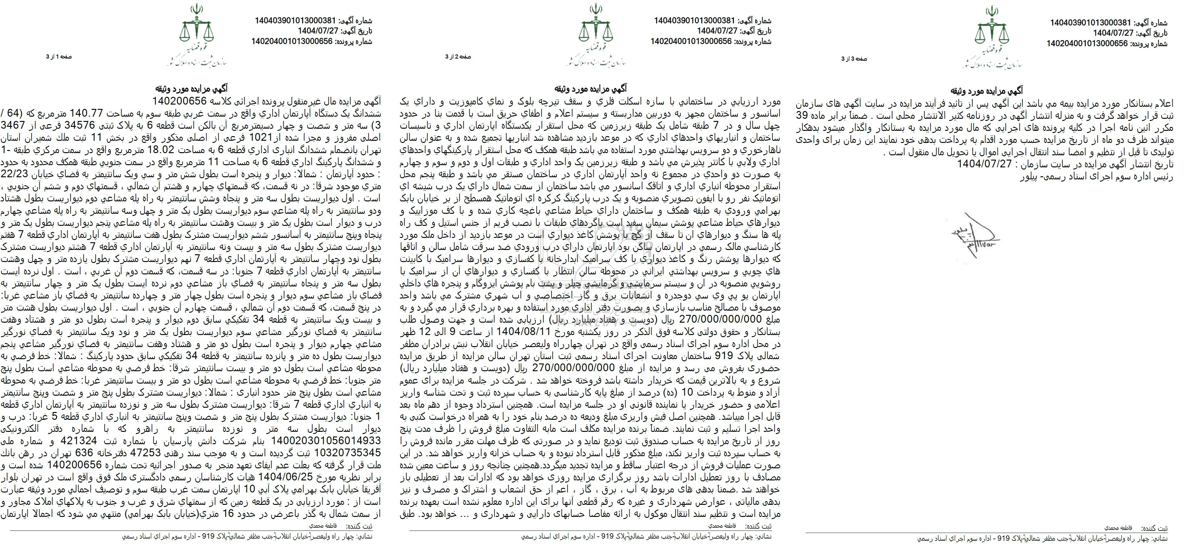 آگهی مزایده مال غیر منقول پرونده اجرائی کلاسه 140200656 ششدانگ یک دستگاه آپارتمان اداری واقع در سمت غربی طبقه سوم به مساحت 140.77 متر مربع که (64/3) سه متر و شصت و چهار دسیمتر مربع آن بالکن است قطعه 6 به پلاک ثبتی 34576 فرعی از 3467 اصلی مقروز و مجزا شده از 1021 فرعی از اصلی مذکور واقع در بخش 11 ثبت ملک شمیران استان تهران بانضمام ششدانگ انباری اداری قطعه 6 به مساحت 18.02 متر مربع واقع در سمت مرکزی طبقه - 1 و ششدانگ پارکینگ اداری قطعه 6 به مساحت 11 متر مربع واقع در سمت جنوبی طبقه همکف محدود به حدود حدود آپارتمان : شمالا دیوار و پنجره است بطول شش متر و سی و یک سانتیمتر به فضای خیابان 22/23 متری موجود شرقا در نه قسمت که قسمتهای چهارم و هشتم آن شمالی ، قسمتهای دوم و ششم آن جنوبی ، است. اول دیواریست بطول سه متر و پنجاه و شش سانتیمتر به راه پله مشاعی دوم دیواریست بطول هشتاد و دو سانتیمتر به راه پله مشاعی سوم دیواریست بطول یک متر و چهل و سه سانتیمتر به راه پله مشاعی چهارم درب و دیوار است بطول یک متر و بیست و هشت سانتیمتر به راه پله مشاعی پنجم دیواریست بطول یک متر و پنجاه و پنج سانتیمتر به آسانسور ششم دیواریست مشترک بطول هفت سانتیمتر به آپارتمان اداری قطعه 7 هفتم دیواریست مشترک بطول سه متر و بیست و نه سانتیمتر به آپارتمان اداری قطعه 7 هشتم دیواریست مشترک بطول نود و چهار سانتیمتر به آپارتمان اداری قطعه 7 نهم دیواریست مشترک بطول یازده متر و چهل و هشت سانتیمتر به آپارتمان اداری قطعه 7 جنوبا در سه قسمت که قسمت دوم آن غربی ، است .