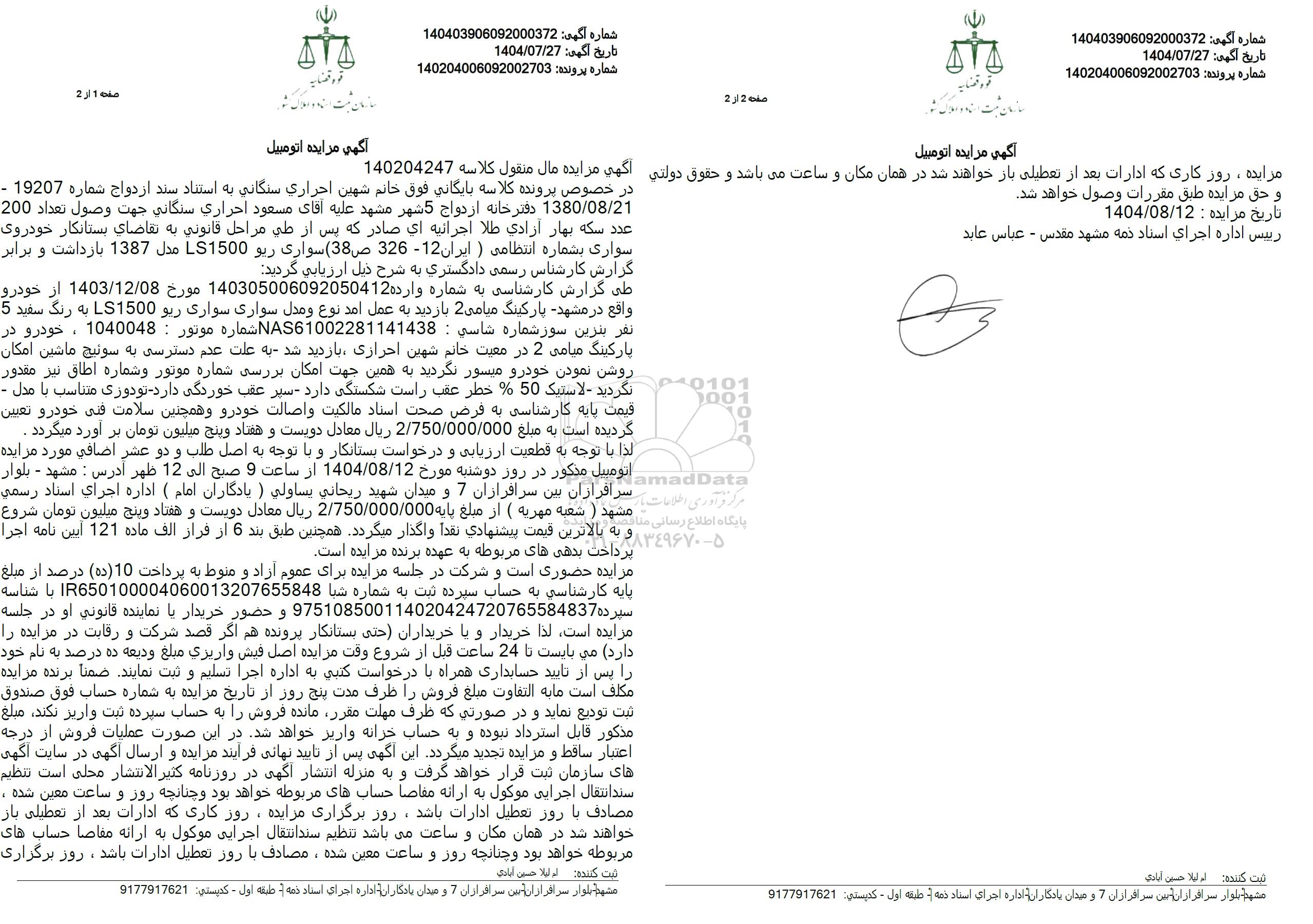 طی گزارش کارشناسی به شماره وارده 140305006092050412 مورخ 1403.12.08 از خودرو واقع در مشهد پارکینگ میامی 2 بازدید به عمل آمد نوع و مدل سواری ریو LS1500 به رنگ سفید 5 شماره موتور : 1040048، خودرو در NAS61002281141438 : نفر بنزین سوزشماره شاسي پارکینگ میامی 2 در معیت خانم شهین احرازی بازدید شد به علت عدم دسترسی به سوئیچ ماشین امکان روشن نمودن خودرو میسور نگردید به همین جهت امکان بررسی شماره موتور و شماره اطاق نیز مقدور نگردید لاستيك 50% خطر عقب راست شکستگی دارد سیر عقب خوردگی دارد تودوزی متناسب با مدل -قیمت پایه کارشناسی به فرض صحت اسناد مالکیت و اصالت خودرو و همچنین سلامت فنی خودرو تعیین گردیده است به مبلغ 2.750.000.000 ريال معادل دویست و هفتاد و پنج میلیون تومان بر آورد میگردد . لذا با توجه به قطعیت ارزیابی و درخواست بستانکار و با توجه به اصل طلب و دو عشر اضافی مورد مزایده اتومبیل مذکور در روز دوشنبه مورخ 1404.08.12 از ساعت 9 صبح الى 12 ظهر آدرس : مشهد - بلوار سرافرازان بین سرافرازان 7 و میدان شهيد ريحاني يساولي ) یادگاران امام ( اداره اجرای اسناد رسمي مشهد ( شعبه مهریه ( از مبلغ پایه 2.750.000.000 ريال معادل دویست و هفتاد و پنج میلیون تومان شروع و به بالاترین قیمت پیشنهادی نقدا واگذار میگردد. همچنین طبق بند 6 از فراز الف ماده 121 آیین نامه اجرا پرداخت بدهی های مربوطه به عهده برنده مزایده است.