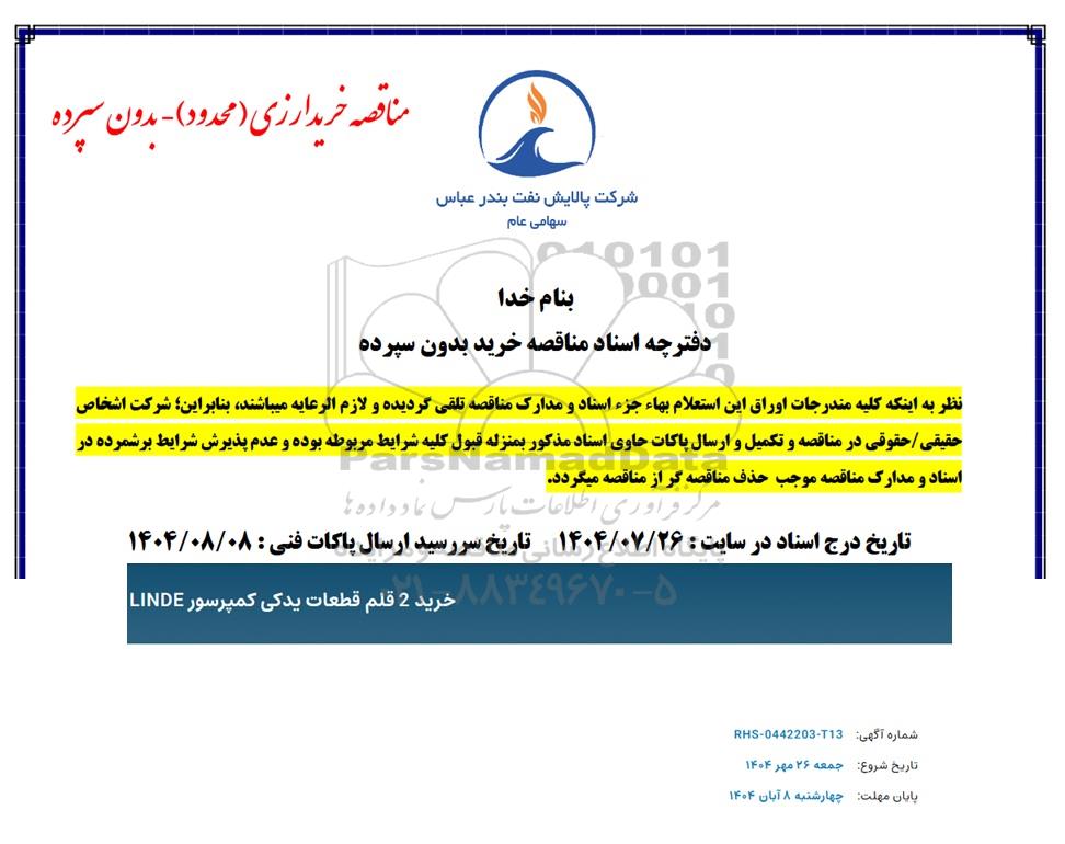 مناقصه خرید 2 قلم قطعات یدکی کمپرسور LINDE از کلیه افراد متخصص و شرکتها واجد شرایط دعوت به عمل میآید در مناقصه با کد خبرگزاری پارس نماد: 9721391 شرکت نمایند.