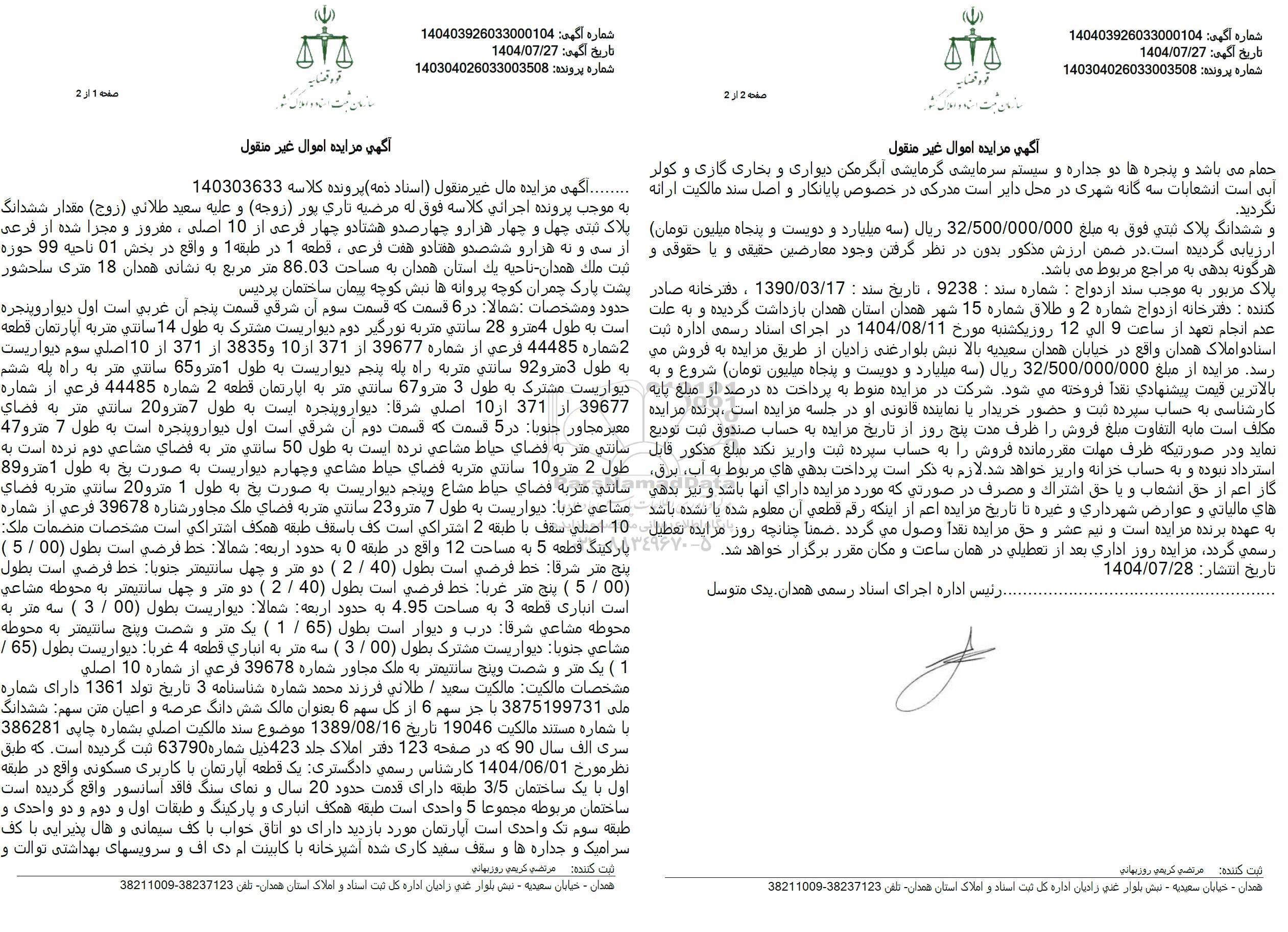 پرونده کلاسه 140303633 به موجب پرونده اجرائی كلاسه فوق له مرضیه تاری پور (زوجه و علیه سعید طلائی (زوج) مقدار ششدانگ پلاک ثبتی چهل و چهار هزار و چهار صد و هشتاد و چهار فرعی از 10 اصلی، مغرور و مجزا شده از فرعی از سی و به هزار و ششصد و هفتاد و هفت فرعی، قطعه 1 در طبقه 1 و واقع در بخش 01 ناحیه 99 حوزه ثبت ملك همدان - ناحیه یک استان همدان به مساحت 86.03 متر مربع به نشانی همدان 18 متری سلحشور پشت پارک چمران کوچه پروانه ها نبش کوچه پیمان ساختمان پردیس حدود و مشخصات شمالا در 6 قسمت که قسمت سوم آن شرقی قسمت پنجم أن غربی است اول دیوار و پنجره است به طول 4 متر و 28 سانتی متر به نورگیر دوم دیواریست مشترک به طول 14 سانتی متر به آپارتمان قطعه 2 شماره 44485 فرعی از شماره 39677 از 371 از 10 و 3835 از 371 از 10 اصلی سوم دیواریست به طول 3 متر و 92 سانتی متر به راه پله پنجم دیواریست به طول 1 متر و 65 سانتی متر به راه پله ششم دیواریست مشترک به طول 3 متر و 67 سانتی متر به آپارتمان قطعه 2 شماره 44485 فرعی از شماره 39677 از 371 از 10 اصلی شرقا دیوار وپنجره ایست به طول 7 متر و 20 سانتی متر به فضای معبر مجاور جنوبا در 5 قسمت که قسمت دوم آن شرقی است اول دیوار و پنجره است به طول 7 متر و 47 سانتی متر به فضای حیاط مشاعی نرده ایست به طول 50 سانتی متر به فضای مشاعی دوم نزده است به طول 2 متر و 10 سانتی متربه فضای حیاط مشاعی و چهارم دیواریست به صورت یخ به طول 1 متر و 89 سانتی متر به فضای حیاط مشاع و پنجم دیواریست به صورت یخ به طول 1 متر و 20 سانتی متربه فضای مشاعی غربا دیواریست به طول 7 متر و 23 سانتی متر به فضای ملک محاور شماره 39678 فرعی از شماره 10 اصلی سقف با طبقه 2 اشتراکی است کف با سقف طبقه همکف اشتراکی است مشخصات منضمات ملک: پارکینگ قطعه 5 به مساحت 12 واقع در طبقه 0 به حدود اربعه شمالا خط فرضی است بطول (00 . 5) پنج متر شرقا خط فرضی است بطول 40 . 2 ) دو متر و چهل سانتیمتر جنوبا خط فرضی است بطول (5.00 ) پنج متر غربا خط فرضی است بطول (2.40 ) دو متر و چهل سانتیمتر به محوطه مشاعی است انباری قطعه 3 به مساحت 4.95 به حدود اربعه شمالا دیواریست بطول 00 . 3 ) سه متر به محوطه مشاعی شرقا درب و دیوار است بطول (65) . 1 ) یک متر و شصت وپنج سانتیمتر به محوطه مشاعی جنوبا دیواریست مشترک بطول (00 . 3 ) سه متر به انباری قطعه 4 غربا دیواریست بطول (65) .(1) یک متر و شصت وپنج سانتیمتر به ملک مجاور شماره 39678 فرعی از شماره 10 اصلی