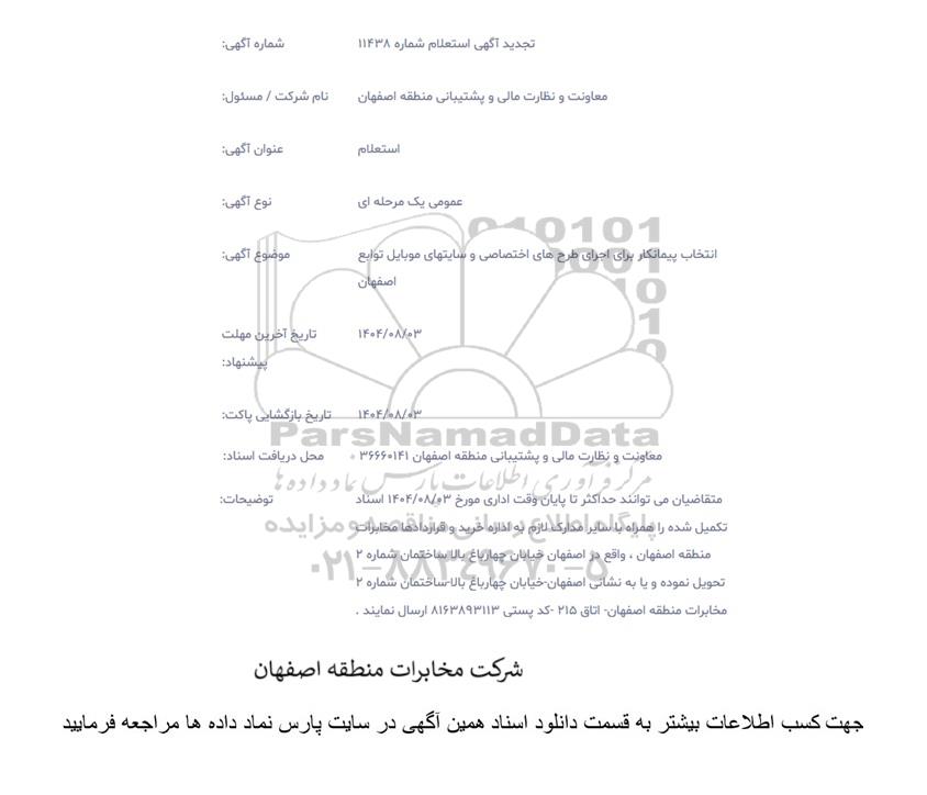 موضوع آگهی : انتخاب پیمانکار برای اجرای طرح های اختصاصی و سایتهای موبایل توابع اصفهان