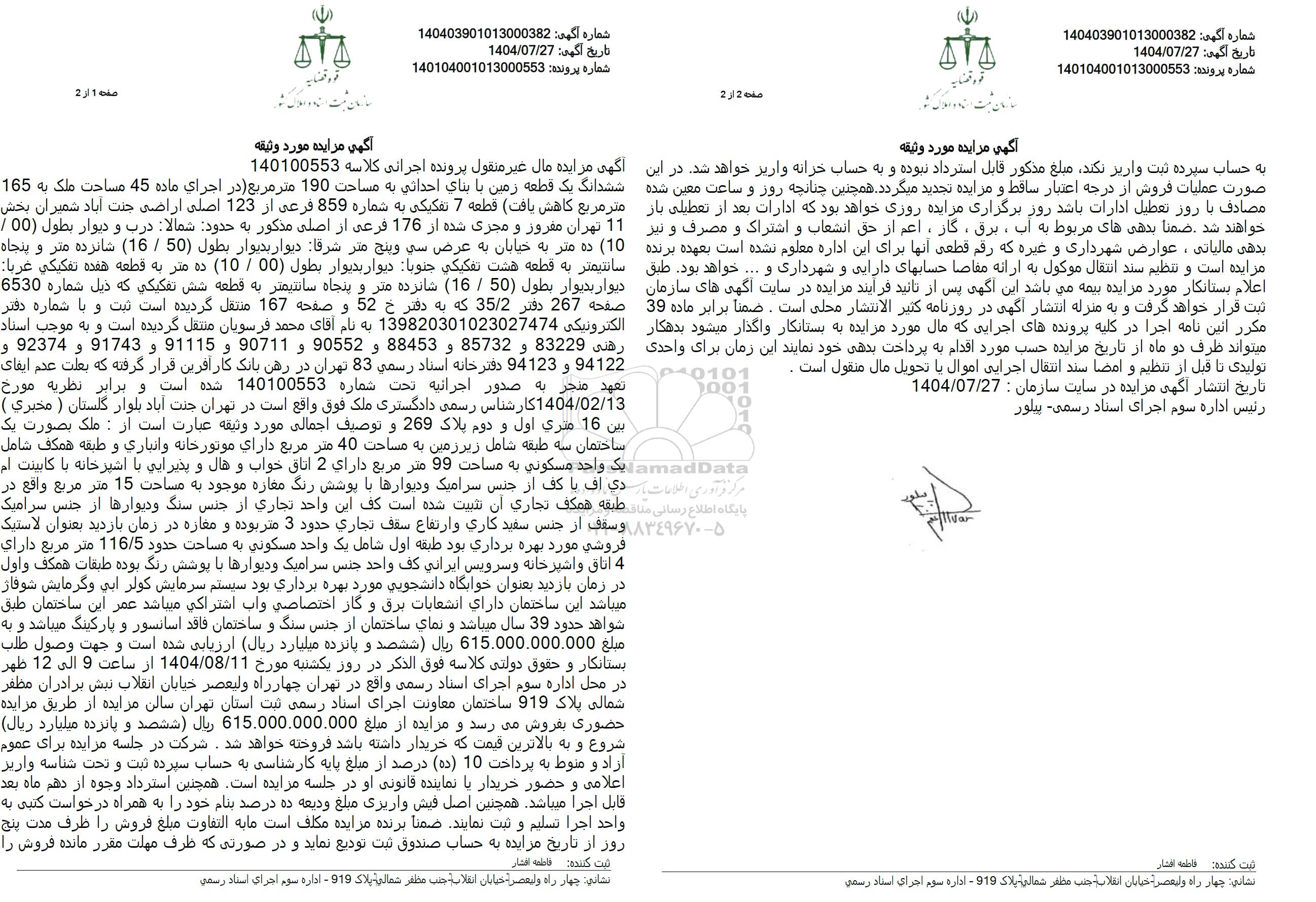 آگهی مزایده مال غیر منقول پرونده اجرائی کلاسه 140100553 ششدانگ یک قطعه زمین با بنای احداثی به مساحت 190 متر مربع در اجرای ماده 45 مساحت ملک به 165 متر مربع کاهش یافت قطعه 7 تفکیکی به شماره 859 فرعی از 123 اصلی اراضی جنت آباد شمیران بخش 11 تهران مغرور و مجری شده از 176 فرعی از اصلی مذکور به حدود شمالا درب و دیوار بطول 00 .(10) ده متر به خیابان به عرض سی و پنج متر شرقا دیوار بدیوار بطول (50) . (16) شانزده متر و پنجاه سانتیمتر به قطعه هشت تفکیکی جنوبا دیوار بدیوار بطول 00 . 10) ده متر به قطعه هفده تفکیکی غربا: دیوار بدیوار بطول (50) . (16) شانزده متر و پنجاه سانتیمتر به قطعه شش تفکیکی که ذیل شماره 6530 صفحه 267 دفتر 35.2 که به دفتر خ 52 و صفحه 167 منتقل گردیده است ثبت و با شماره دفتر الکترونیکی 139820301023027474 به نام آقای محمد فرسویان منتقل گردیده است و به موجب اسناد رهنی 83229 و 85732 و 88453 و 90552 و 90711 و 91115 و 91743 و 92374 و 94122 و 94123 دفترخانه اسناد رسمی 83 تهران در رهن بانک کارآفرین قرار گرفته که بعلت عدم ایفای تعهد منجر به صدور اجرائیه تحت شماره 140100553 شده است و برابر نظریه مورخ 1404.02.13 کارشناس رسمی دادگستری ملک فوق واقع است در تهران جنت آباد بلوار گلستان ( مخبری ) بین 16 متری اول و دوم پلاک 269 و توصیف اجمالی مورد وثیقه عبارت است از: ملک بصورت یک ساختمان سه طبقه شامل زیر زمین به مساحت 40 متر مربع دارای موتورخانه و انباری و طبقه همکف شامل یک واحد مسکونی به مساحت 99 متر مربع دارای 2 اتاق خواب و هال و پذیرایی با اشپزخانه با کابینت ام دی اف با کف از جنس سرامیک و دیوارها با پوشش رنگ مغازه موجود به مساحت 15 متر مربع واقع در طبقه همکف تجاری ان تثبیت شده است کف این واحد تجاری از جنس سنگ و دیوارها از جنس سرامیک و سقف از جنس سفید کاری و ارتفاع سقف تجاری حدود 3 متر بوده و مغازه در زمان بازدید بعنوان لاستیک فروشی مورد بهره برداری بود طبقه اول شامل یک واحد مسکونی به مساحت حدود 116.5 متر مربع دارای 4 اتاق واشیر خانه و سرویس ایرانی کف واحد جنس سرامیک و دیوارها با پوشش رنگ بوده طبقات همکف واول در زمان بازدید بعنوان خوابگاه دانشجویی مورد بهره برداری بود سیستم سرمایش کولر آبی و گرمایش شوفاژ میباشد این ساختمان دارای انشعابات برق و گار اختصاصی واب اشتراکی میباشد عمر این ساختمان طبق شواهد حدود 39 سال میباشد و نمای ساختمان از جنس سنگ و ساختمان فاقد آسانسور و پارکینگ میباشد و به مبلغ 615.000.000.000 ریال ششصد و پانزده میلیارد ریال ارزیابی شده است و جهت وصول طلب بستانکار و حقوق دولتی کلاسه فوق الذکر در روز یکشنبه مورخ 1404.08.11 از ساعت 9 الى 12 ظهر در محل اداره سوم اجرای اسناد رسمی واقع در تهران چهارراه ولیعصر خیابان انقلاب نیش برادران مظفر شمالی پلاک 919 ساختمان معاونت اجرای اسناد رسمی ثبت استان تهران سالن مزایده از طریق مزایده حضوری بفروش میرسد و مزایده از مبلغ 615.000.000.000 ریال ششصد و پانزده میلیارد ریال شروع و به بالاترین قیمت که خریدار داشته باشد فروخته خواهد شد. شرکت در جلسه مزایده برای عموم آزاد و منوط به پرداخت 10 (ده) درصد از مبلغ پایه کارشناسی به حساب سپرده ثبت و تحت شناسه واریز اعلامی و حضور خریدار با نماینده قانونی او در جلسه مزایده است. همچنین استرداد وجوه از دهم ماه بعد قابل اجرا میباشد. همچنین اصل فیش واریزی مبلغ ودیعه ده درصد بنام خود را به همراه درخواست کتبی به واحد اجرا تسلیم و ثبت نمایند. ضمنا برنده مزایده مکلف است ما به التفاوت مبلغ فروش را ظرف مدت پنج روز از تاریخ مزایده به حساب صندوق ثبت تودیع نماید و در صورتی که ظرف مهلت مقرر مانده فروش را به حساب سپرده ثبت واریز نکند مبلغ مذکور قابل استرداد نبوده و به حساب خزانه واریز خواهد شد. در این صورت عملیات فروش از درجه اعتبار ساقط و مزایده تجدید میگردد. همچنین چنانچه روز و ساعت معین شده مصادف با روز تعطیل ادارات باشد روز برگزاری مزایده روزی خواهد بود که ادارات بعد از تعطیلی باز خواهند شد . ضمنا بدهی های مربوط به آب، برق، گاز، اعم از حق انشعاب و اش