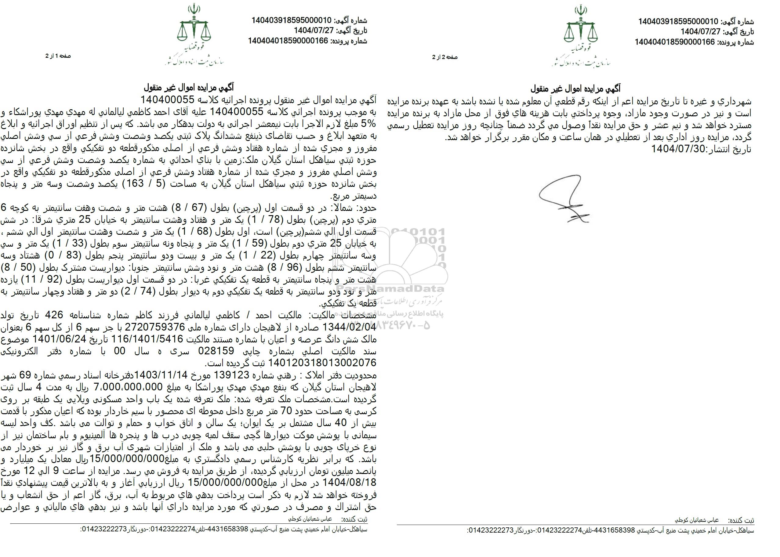 به موجب پرونده اجرائي كلاسه 140400055 علیه آقای احمد کاظمي ليالمانی له مهدی مهدی پوراشكاء و %5% مبلغ لازم الاجرا بابت نیم عشر اجرائی به دولت بدهکار میباشد که پس از تنظیم اوراق اجرائیه و ابلاغ به متعهد ابلاغ و حسب تقاضای ذینفع ششدانگ پلاک ثبتی یکصد و شصت و شش فرعی از سی وشش اصلی مفرور و مجری شده از شماره هفتاد و شش فرعی از اصلی مذکور قطعه دو تفكيكی واقع در بخش شانزده حوزه ثبتی سياهکل استان گیلان ملک زمین با بنای احداثی به شماره یکصد و شصت و شش فرعی از سی و شش اصلی مفروز و مجزی شده از شماره هفتاد و شش فرعی از اصلی مذکور قطعه دو تفکیکی واقع در بخش شانزده حوزه ثبتی سياهکل استان گیلان به مساحت 163.5 يكصد و شصت و سه متر و پنجاه دسیمتر مربع.