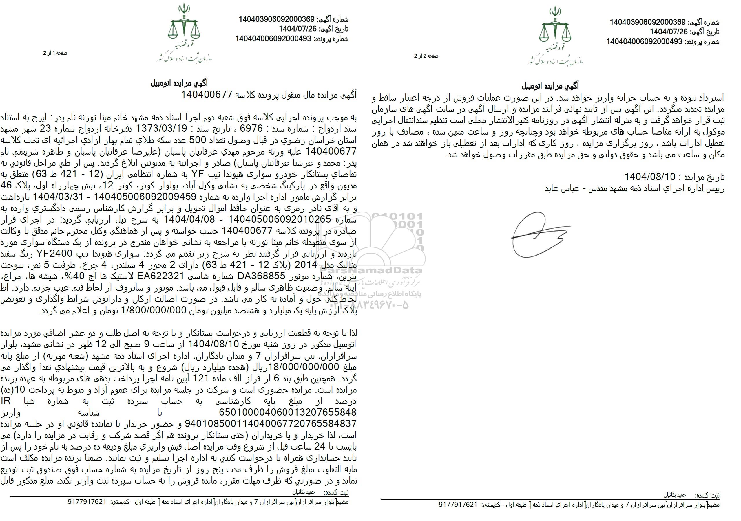 به موجب پرونده اجرایی کلاسه فوق شعبه دوم اجرا استاد دمه مشهد خانم مینا تورنه نام پدر ایرج به استناد سند ازدواج : شماره سند : 6976، تاریخ سند : 1373.03.19 دفترخانه اردواج شماره 23 شهر مشهد استان خراسان رضوی در قبال وصول تعداد 500 عدد سکه طلای تمام بهار آزادی اجرائیه ای تحت کلاسه 140400677 عليه ورته مرحوم مهدي عرفانیان باستان (علیرضا) عرفانیان پاسبان و طاهره شریعتی نام پدر محمد و عرشیا عرفانیان (پاسیان صادر و اجرائیه به مدیونین ابلاغ گردید. پس از طی مراحل قانونی به تقاضای بستانکار خودرو سواری هیوندا تیپ YF به شماره انتظامی ایران (12) - 421 ط (63) متعلق به مدیون واقع در پارکینگ شخصی به نشانی وکیل آباد بولوار کوثر کوثر 12 نبش چهارراه اول پلاک 46 برابر گزارش مامور اداره اجرا وارده به شماره 140405006092009459 - 1404.03.31 بازداشت و به آقای نادر رمزی به عنوان حافظ اموال تحویل و برابر گزارش کارشناس رسمی دادگستری وارده به شماره 140405006092010265 - 1404.04.08 به شرح ذیل ارزیابی گردید در اجرای قرار صادره در پرونده کلاسه 140400677 حسب خواسته و پس از هماهنگی وکیل محترم خانم مدقق با وکالت از سوی متعهدله خانم مینا تورته با مراجعه به نشانی خواهان مندرج در پرونده از یک دستگاه سواری مورد بازدید و ارزیابی قرار گرفتند نظر به شرح زیر تقدیم میگردد سواری هیوندا تیپ YF2400 رنگ سفید متالیک مدل 2014 پلاک 12 - 421 ط (63) دارای 2 محور 4 سیلندر 4 چرخ ظرفیت 5 نفر سوخت بترین شماره موتور DA368855 شماره شاسی EA622321 لاستیک ها آج %40% ، شیشه ها، چراغ اینه سالم وضعیت ظاهری سالم و قابل قبول میباشد. موتور و سانروف از لحاظ فنی عیب جزنی دارد. اط لحاظ کلی خول و آماده به کار می باشد در صورت اصالت ارکان و دارا بودن شرایط واگذاری و تعویض پلاک ارزش پایه یک میلیارد و هشتصد میلیون تومان 1.800.000.000 تومان و اعلام می گردد.