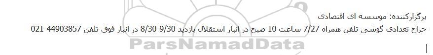 مزایده عمومی حراج تعدادی گوشی تلفن همراه برگزار میگردد. از کلیه افراد متخصص و شرکتهای واجد شرایط دعوت به عمل میآید تا در این مزایده با کد خبرگزاری پارس نماد : 9721405 شرکت نمایند تاریخ شروع مزایده : 1404/07/27 مهلت شرکت در مزایده: تا پایان روز 1404/08/07 مکان برگزاری اموال واگذاری استانهای تهران و دستهبندیهای مربوط به این حراجی مخابرات میباشد.