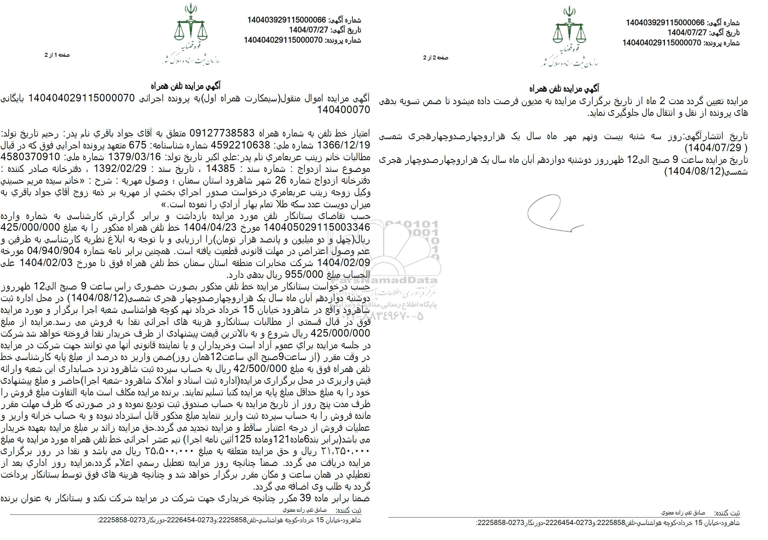 حسب تقاضای بستانکار تلفن مورد مزایده بازداشت و برابر گزارش کارشناسی به شماره وارده 425.000.000 140405029115003346 مورخ 1404.04.23 خط تلفن همراه مذکور را به مبلغ ریال چهل و دو میلیون و پانصد هزار تومان را ارزیابی و با توجه به ابلاغ نظریه کارشناسی به طرفین و عدم وصول اعتراض در مهلت قانونی قطعیت یافته است. همچنین برابر نامه شماره 04.940.904 مورخه 1404.02.09 شرکت مخابرات منطقه استان سمنان خط تلفن همراه فوق تا مورخ 1404.02.03 على الحساب مبلغ 955.000 ریال بدهی دارد.