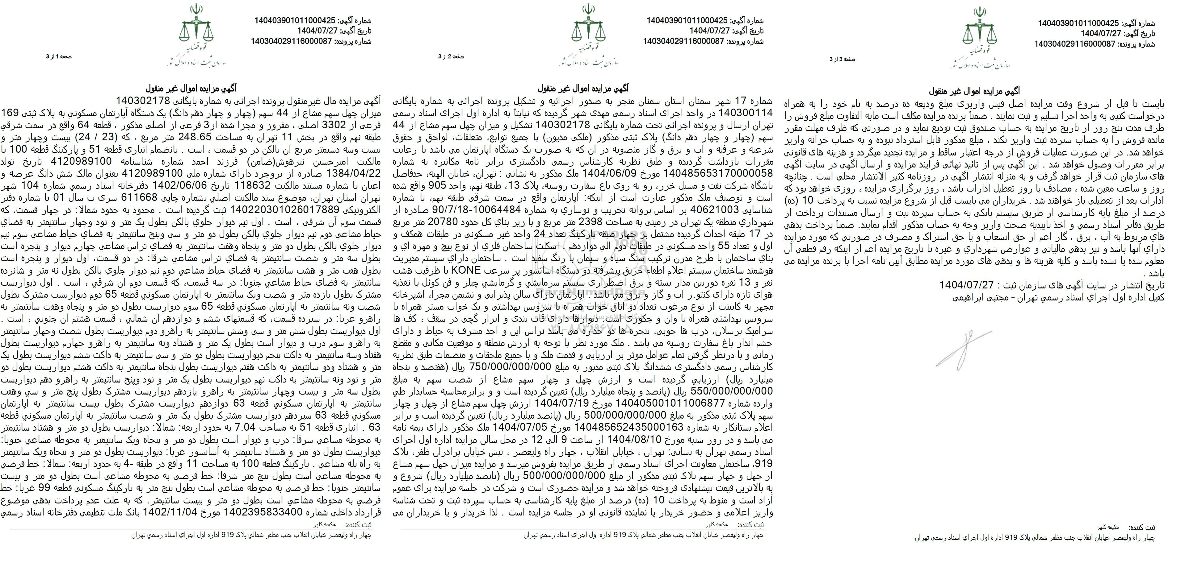 مزایده فروش میزان چهل سهم مشاع از 44 سهم (چهار و چهار دهم دانگ ) یک دستگاه آپارتمان مسکونی به پلاک ثبتی 169 فرعی از 3302 اصلی