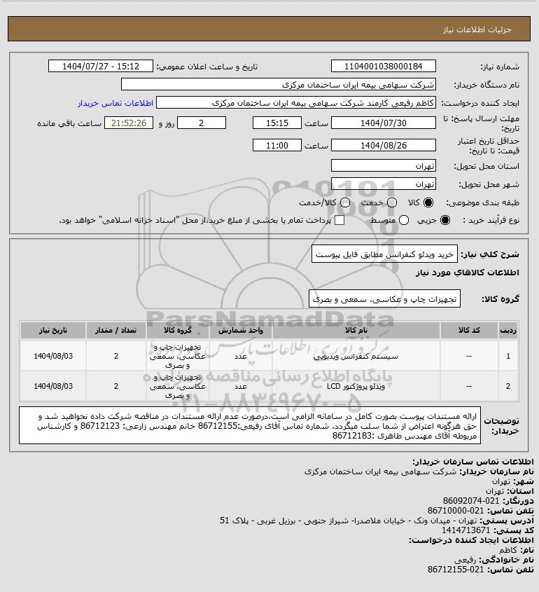 شرح کلی نیاز: خرید ویدئو کنفرانس مطابق فایل پیوست