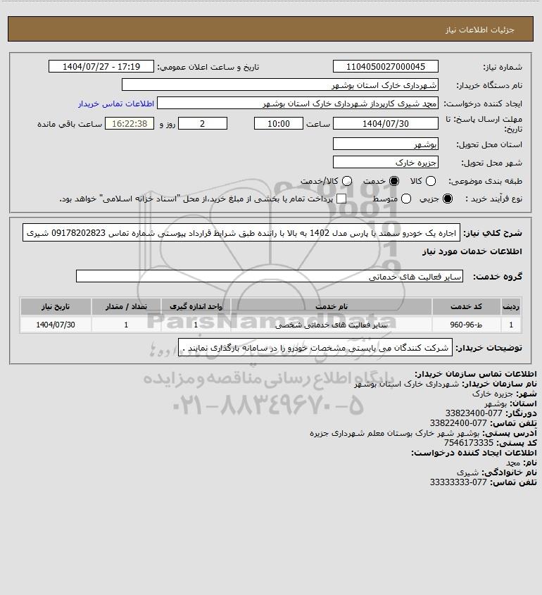 استعلام اجاره یک خودرو سمند یا پارس مدل 1402 به بالا با راننده طبق شرایط قرارداد پیوستی شماره تماس 09178202823 شیری, استعلام اجاره یک خودرو سمند یا پارس مدل 1402 به بالا با راننده طبق شرایط قرارداد پیوستی شماره تماس 09178202823 شیری