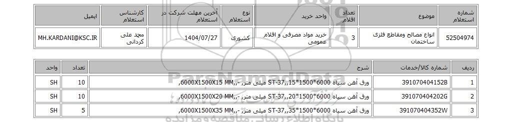 52504974انواع مصالح ومقاطع فلزی ساختمان3خرید مواد مصرفی و اقلام عمومیکشوری1404/07/27محمد علی کردانیMH.KARDANI@KSC.IR