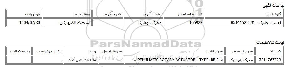 | احسان چابوک - 05141522291 | 165928 | محرک پنوماتیک | استعلام الکترونیکی | 1404/07/30 |