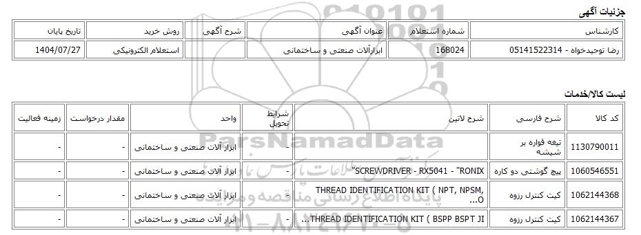 رضا توحیدخواه - 05141522314 | 168024 | ابزارآلات صنعتی و ساختمانی | استعلام الکترونیکی | 1404/07/27 |