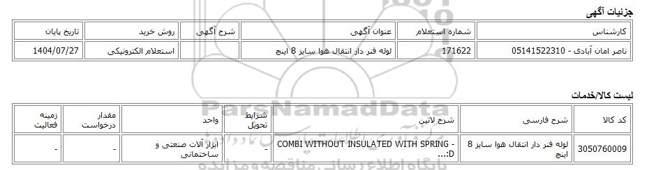 استعلام الکترونیکی لوله فنر دار انتقال هوا سایز 8 اینچ, استعلام الکترونیکی، لوله فنر دار انتقال هوا سایز 8 اینچ
