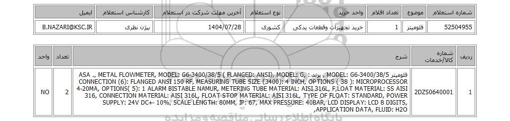 | 52504955 | فلومیتر | 1 | خرید تجهیزات وقطعات یدکی | کشوری | 1404/07/28 | بیژن نظری | B.NAZARI@KSC.IR |