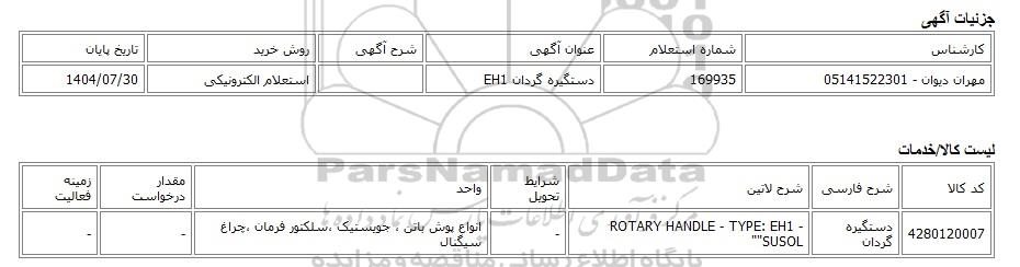 | مهران دیوان - 05141522301 | 169935 | دستگیره گردان EH1 | استعلام الکترونیکی | 1404/07/30 |