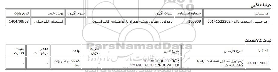 | امیرحسین اسعدی نژاد - 05141522302 | 165909 | ترموکوپل مطابق نقشه همراه با گواهینامه کالیبراسیون | استعلام الکترونیکی | 1404/08/03 |