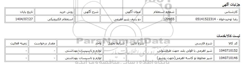 رضا توحیدخواه - 05141522314172055دو ردیف شیر اهرمیاستعلام الکترونیکی1404/07/27