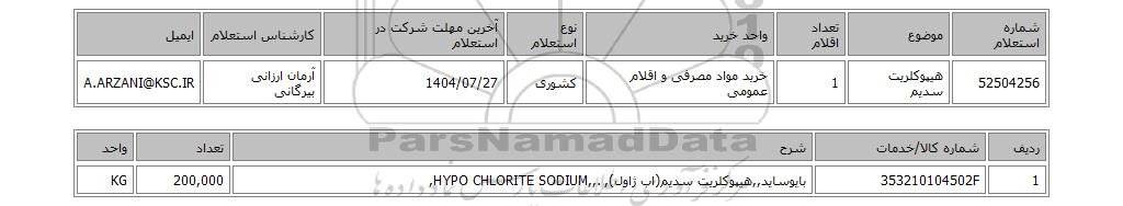 52504256هیپوکلریت سدیم1خرید مواد مصرفی و اقلام عمومیکشوری1404/07/27آرمان ارزانی بیرگانیA.ARZANI@KSC.IR