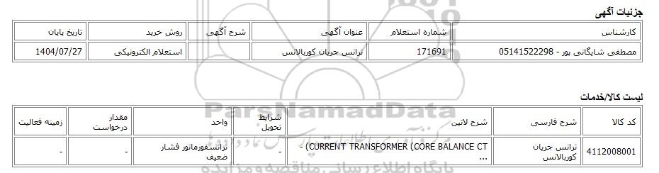 مصطفی شایگانی پور - 05141522298 | 171691 | ترانس جریان کوربالانس | استعلام الکترونیکی | 1404/07/27 |