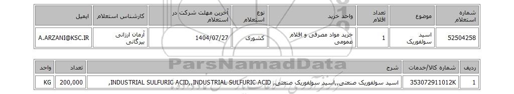 | 52504258 | اسید سولفوریک | 1 | خرید مواد مصرفی و اقلام عمومی | کشوری | 1404/07/27 | آرمان ارزانی بیرگانی | A.ARZANI@KSC.IR |