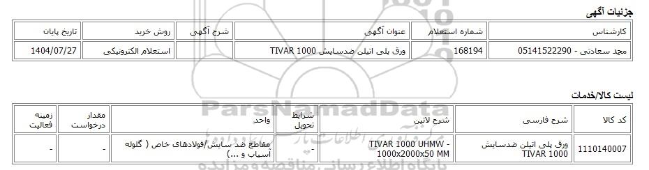 محمد سعادتی - 05141522290168194ورق پلی اتیلن ضدسایش TIVAR 1000استعلام الکترونیکی1404/07/27