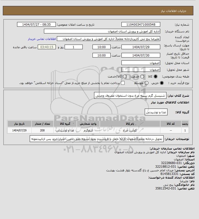شرح کلی نیاز: شنیسل گرم سینه مرغ بدون استخوان غضروف وچربی