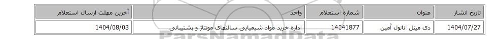 | 1404/07/27 | دی میتل اتانول آمین | 14041877 | اداره خرید مواد شیمیایی سالنهای مونتاژ و پشتیبانی | 1404/08/03 |