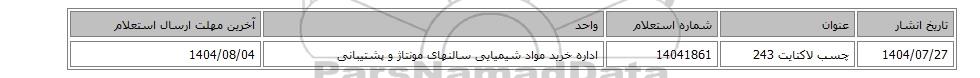 | 1404/07/27 | چسب لاکتایت 243 | 14041861 | اداره خرید مواد شیمیایی سالنهای مونتاژ و پشتیبانی | 1404/08/04 |