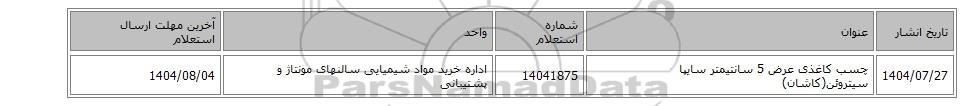 | 1404/07/27 | چسب کاغذی عرض 5 سانتیمتر سایپا سیتروئن(کاشان) | 14041875 | اداره خرید مواد شیمیایی سالنهای مونتاژ و پشتیبانی | 1404/08/04 |
