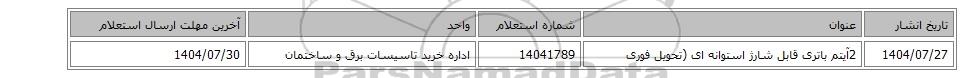 | 1404/07/27 | 2آیتم باتری قابل شارژ استوانه ای (تحویل فوری | 14041789 | اداره خرید تاسیسات برق و ساختمان | 1404/07/30 |