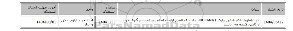 | 1404/05/12 | کارت/ماژول الکترونیکی مارک INDRAMAT زمان بری تامین اولویت اصلی در تصمصم گیری خرید از تامین کننده می باشد | 14041233 | اداره خرید لوازم یدکی و ابزار | 1404/08/01 |