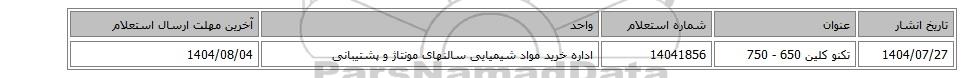 | 1404/07/27 | تکنو کلین 650 - 750 | 14041856 | اداره خرید مواد شیمیایی سالنهای مونتاژ و پشتیبانی | 1404/08/04 |